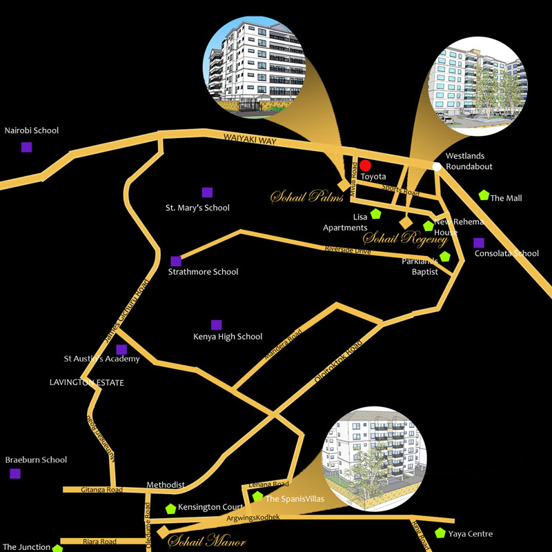 The development is well positioned permitting easy access to Ngong Road, Lenana Road and Nairobi’s new Link Road providing residents convenient connectability to all parts of Nairobi and major schools, several commercial shopping centres and health facilities. Spacious living and dining rooms with balconies allowing residents to enjoy Nairobi's lovely climate, high security features including CCTV cameras, generous bedrooms, lifts, water supply backed up by on-site borehole, and a complete power backup generator are only some of the salient details of SOHAIL MANOR which combined together present a fresh and distinctive lifestyle designed to accommodate those accustomed to quality. The project’s interiors are carefully detailed with significant highlights being a fully equipped kitchen complete with cooking oven, fridge, cooking hob, microwave oven, cooking hood and high quality instant showers in each bathroom.